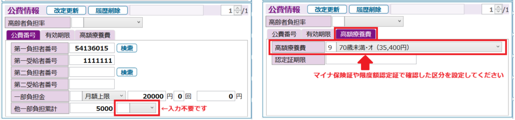 従前より、特定医療に係る医療保険の給付については「通常の高額療養費に準じて、所得区分別の自己負担限度額が適用される」ことになっている為、公費情報の『高額療養費』に設定された区分のみにてレセプト特記事項記載を決定します。